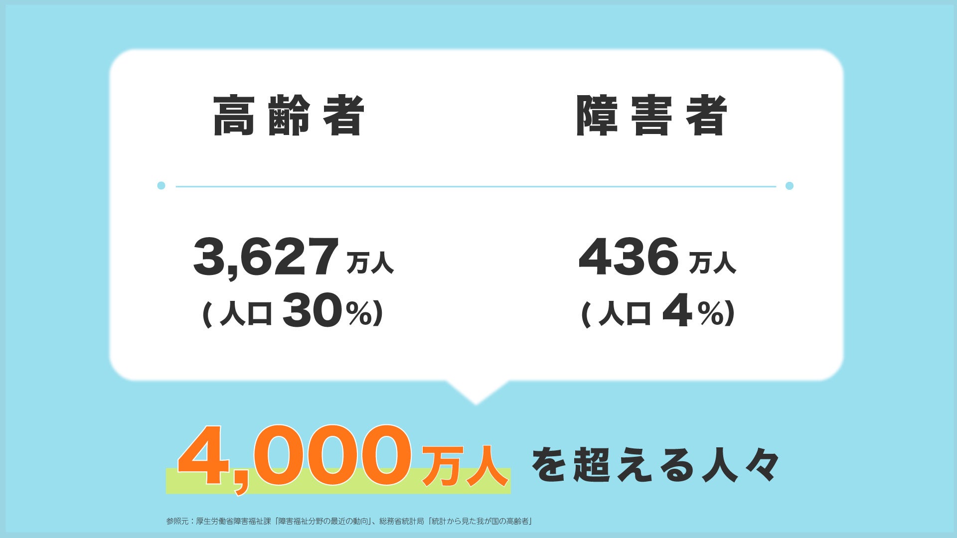 施設や店舗のバリアフリー対策をすることで、結果的に身体障害者だけでなく、バリアフリー化を求めている高齢者も合わせた4,000万人以上の人達にアプローチができることがわかります。日本人口の約3分の1近くの人たちがバリアフリーを意識しているとも言えます。