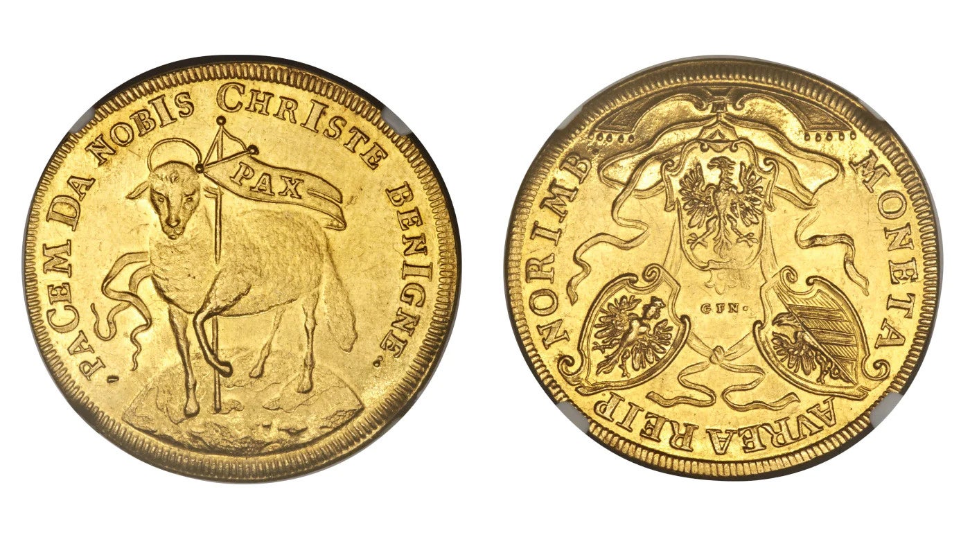 17~19世紀にかけて神聖ローマ帝国(現在のドイツ)のニュルンベルクで発行されたコインです。中央にキリストを象徴する羊が描かれ、平和をテーマにしたデザインが施されています。発行された時代の歴史を辿って行くと、「三十年戦争」という長く悲惨な戦争で疲弊した神聖ローマ帝国において、平和を願う当時の人々の気持ちが伝わってきます。平和を愛する日本人に特に人気のコインです。