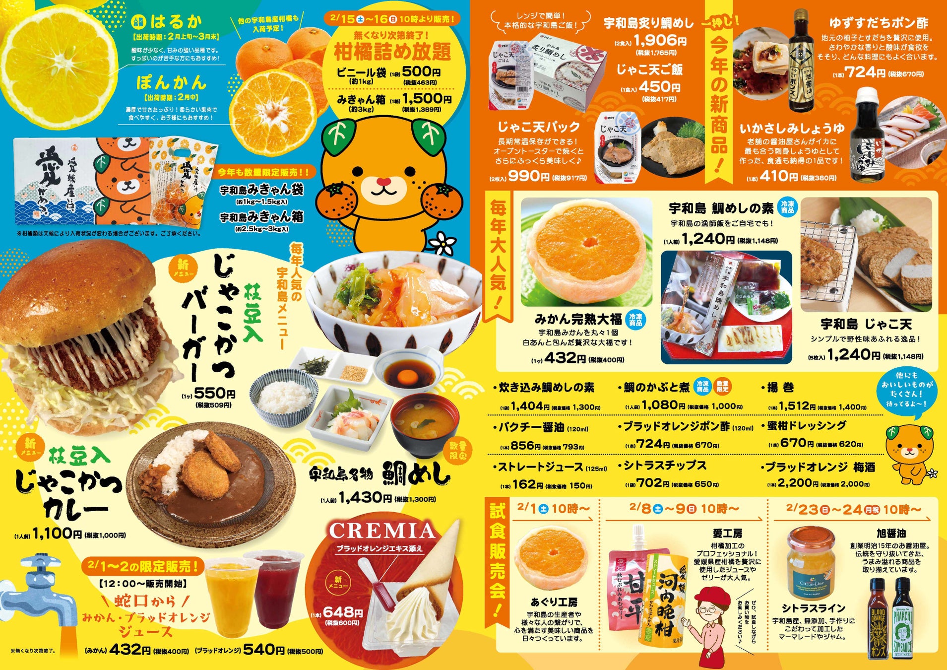 定番となった「宇和島鯛めし」のほか、宇和島産のブラッドオレンジエキスを添えた「ソフトクリームCREMIA」、「蛇口からみかんジュース&ブラッドオレンジジュース」、姉妹都市提携50周年を記念して製作した宇和島の特産品であるじゃこカツと枝豆を混ぜ込んだ「枝豆入じゃこカツ」をバンズで挟んだ「枝豆入じゃこカツバーガー」などが新発売されます。