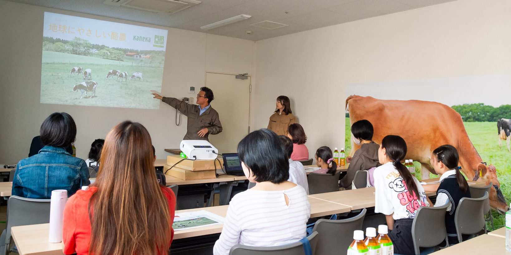 会場に、実物サイズの牛のパネルや牛の糞からできた肥料を展示する等、子どもたちが有機酪農を知り、身近に感じられる工夫を行いました。