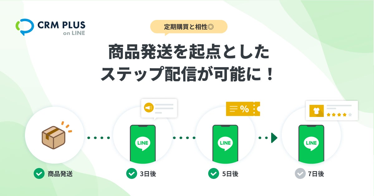 そこで、この度「CRM PLUS on LINE」に、特定の商品発送を起点にステップ配信を行える機能を追加しました。これにより、「CRM PLUS on LINE」を利用するマーチャントは、運用負荷を削減しながら、顧客行動に即した効果的かつ継続的なコミュニケーションを実現できるようになりました。