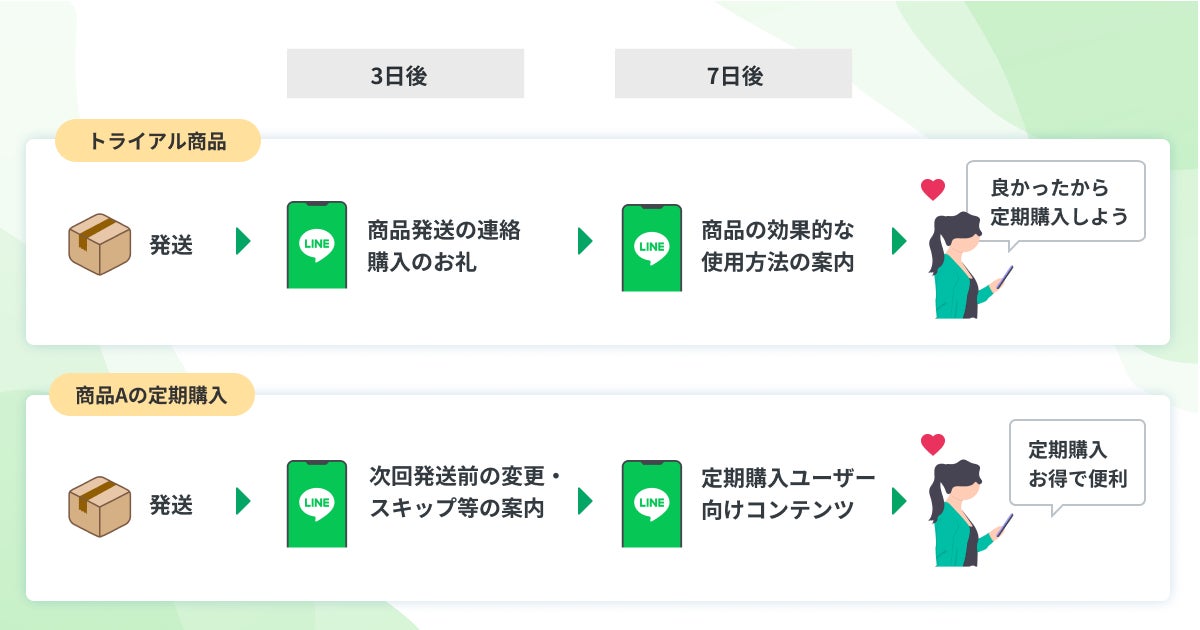 特に定期購買ECとの相性が良く、トライアル商品購入からの商品理解促進や、定期購入スタート後の配送前の変更・スキップ案内などに効果的に活用いただけます。またキャリアメールで発送案内が届かないユーザーに向けて、LINE公式アカウントから簡易的な商品発送案内も配信できます。
