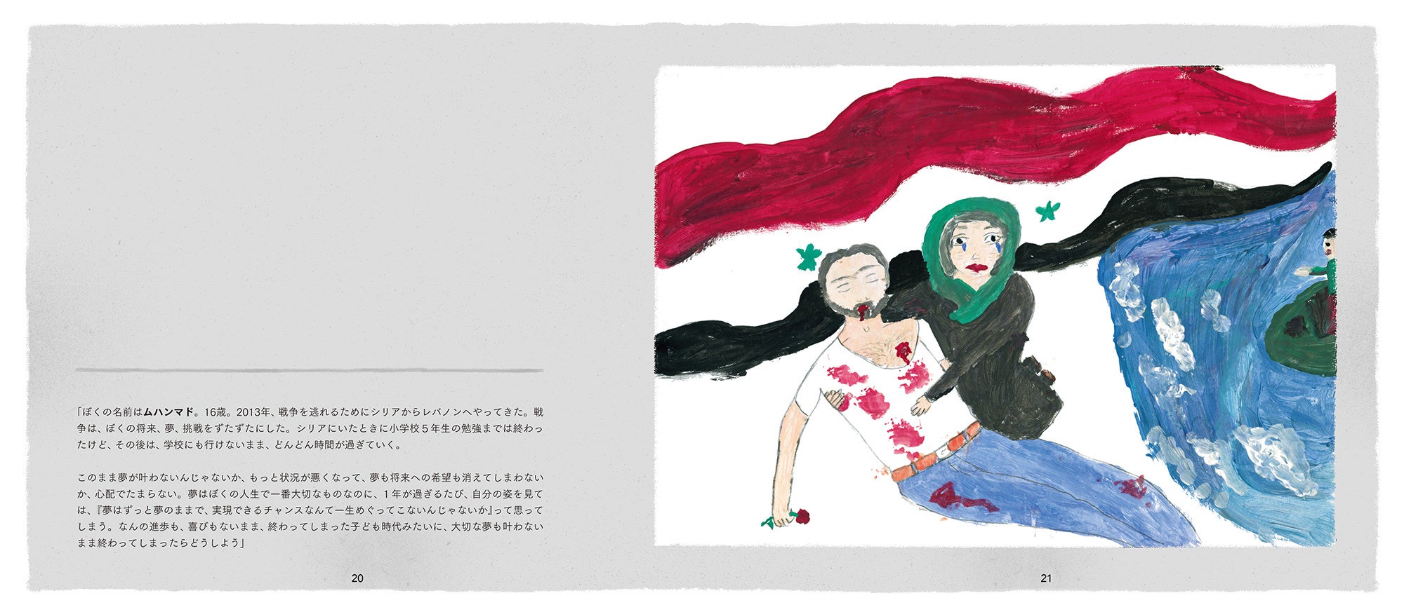 さらに、難民の子どもたちにこれまでの体験を、言葉と絵で表現してもらいました。