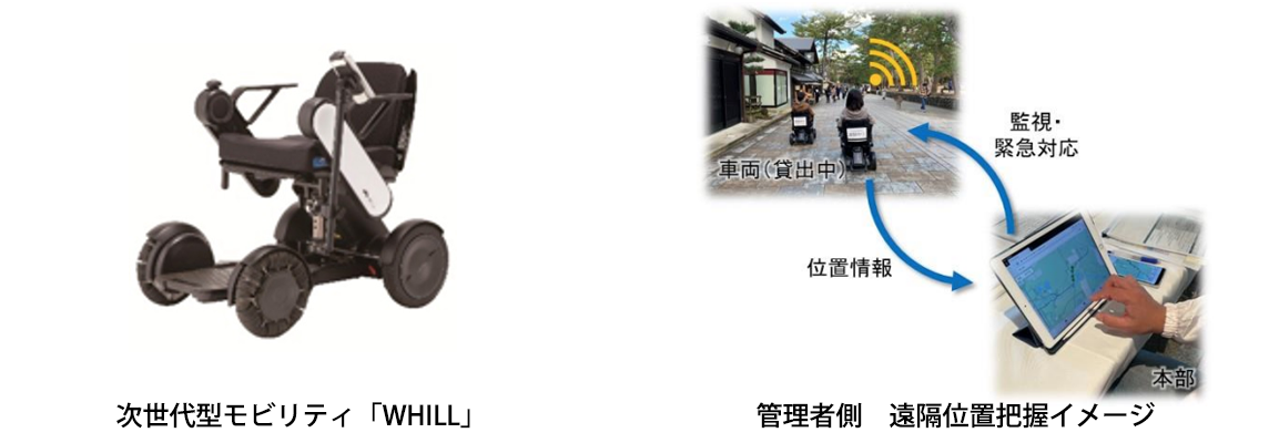 本実証実験においては、次世代型電動車椅子のリアルタイムな位置情報を把握し、車両が実証エリアから逸脱した場合には、利用者に実証エリア外に出ていることをスマートフォン経由で注意喚起するとともに、関係者にアラート通知が発出される仕組みを提供します。