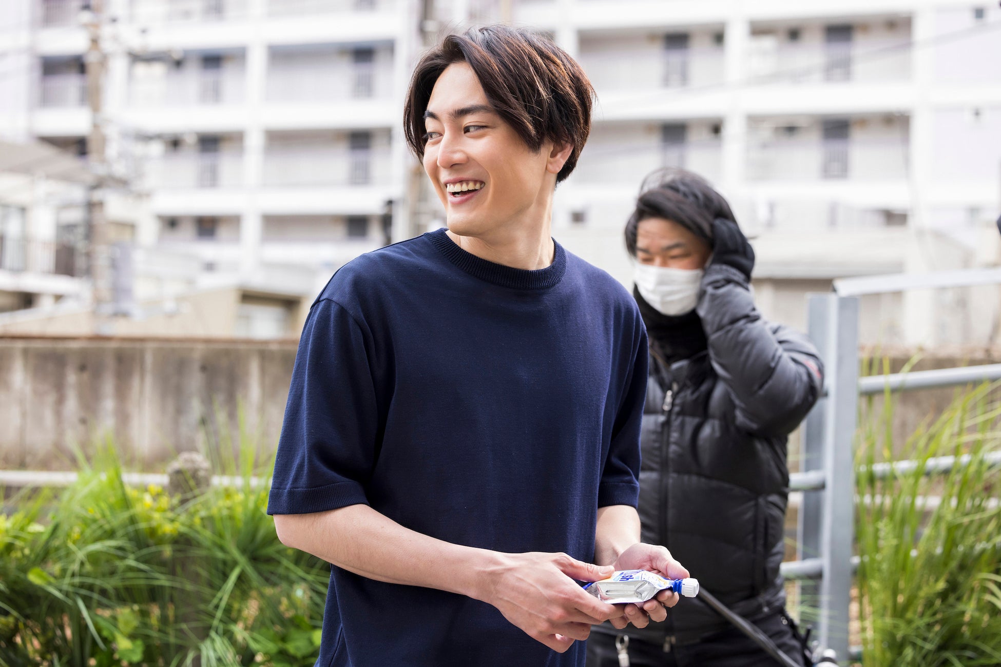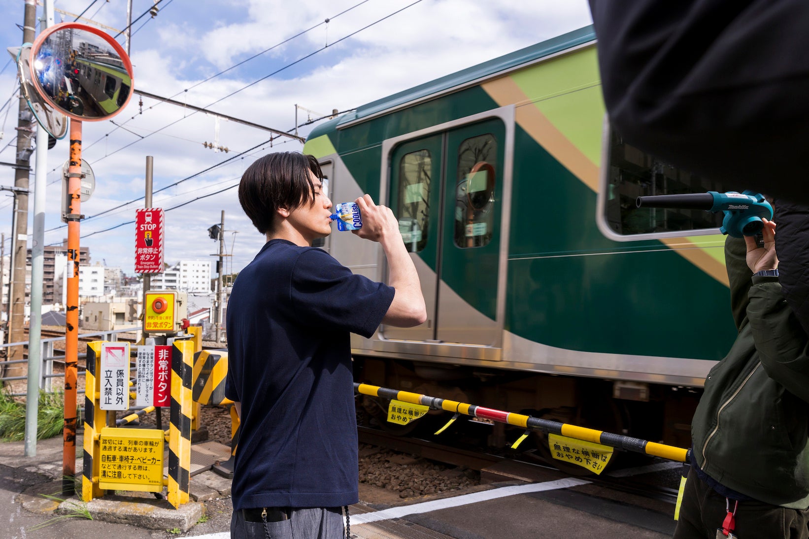 間宮さん:ご覧の皆さん、間宮祥太朗です。今回は「もう待てない!」と⾔う、我慢できずクーリッシュを飲むTVCMなんですけれども、踏切と電⾞のタイミングが重要になった撮影だったので、「あと2分後に電⾞くる・・・あ、でもこれは狙いの電⾞じゃなかった!」とか、「これ⾒逃す?いや⾏こう(撮影しよう)!」と、⾊々なタイミングや状況の判断でばーっと動く感じでし た。
