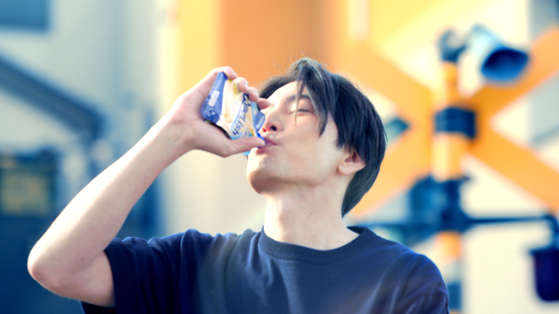 しかし今⽇は、太陽がジリジリと照りつける暑い⽇。もう間宮さんは待ちきれず、電⾞が踏み切り付近を通り過ぎる間、「クーリッシュ」だけに集中。商品の蓋を開け、⼀気に飲みだします!