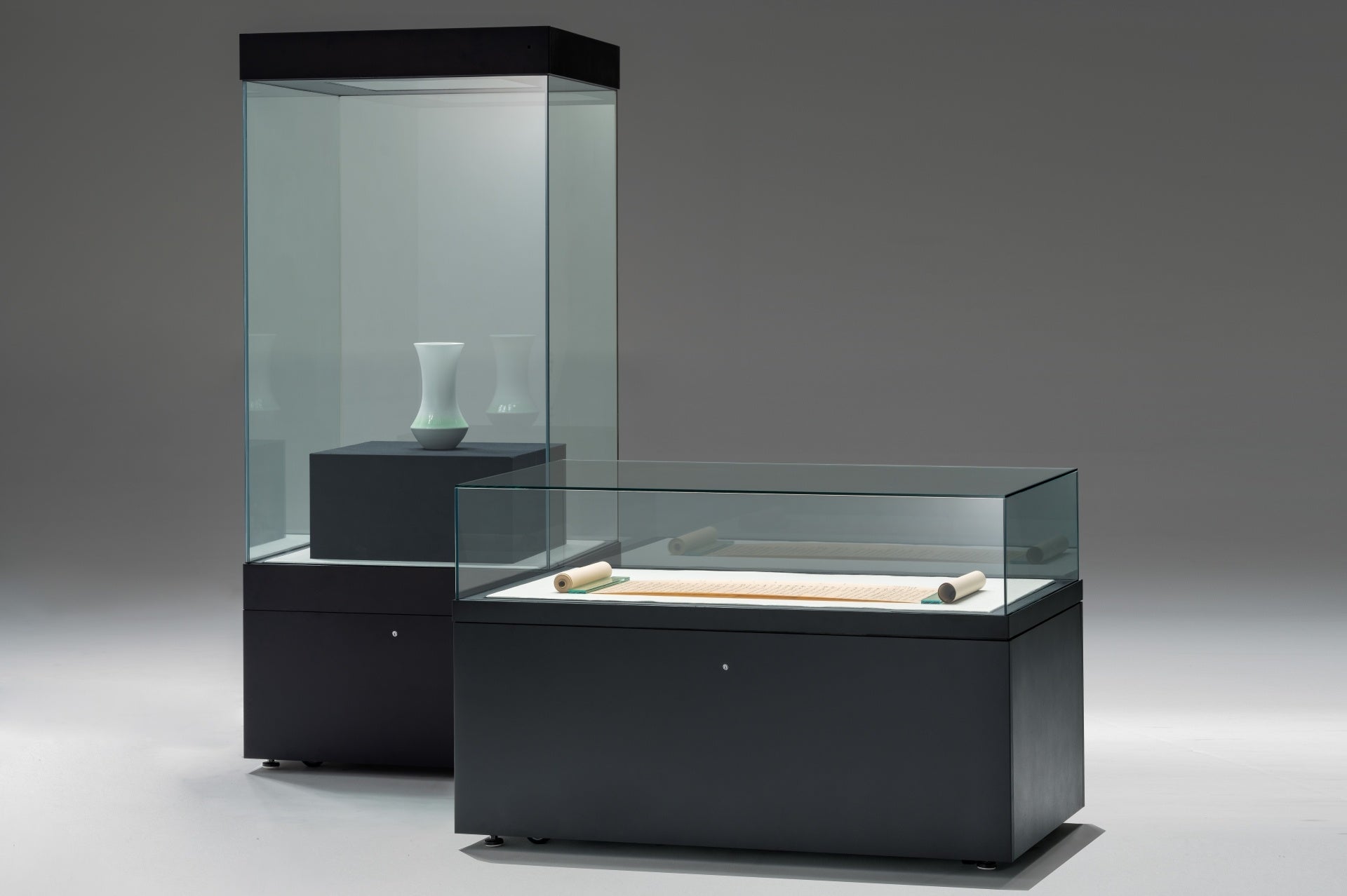 展示ケースの形状は、平型のぞきケースと行灯型ケースの2機種をラインアップ。高透過ガラスや低反射フィルム、照明の仕様など、豊富なオプションを組み合わせてお客様に最適な展示ケースをご提供いたします。