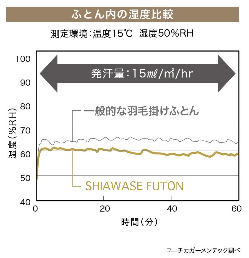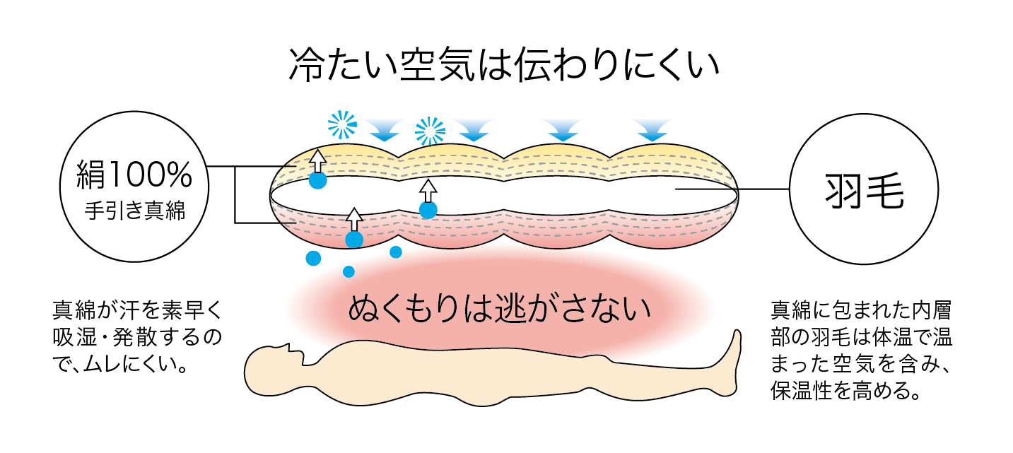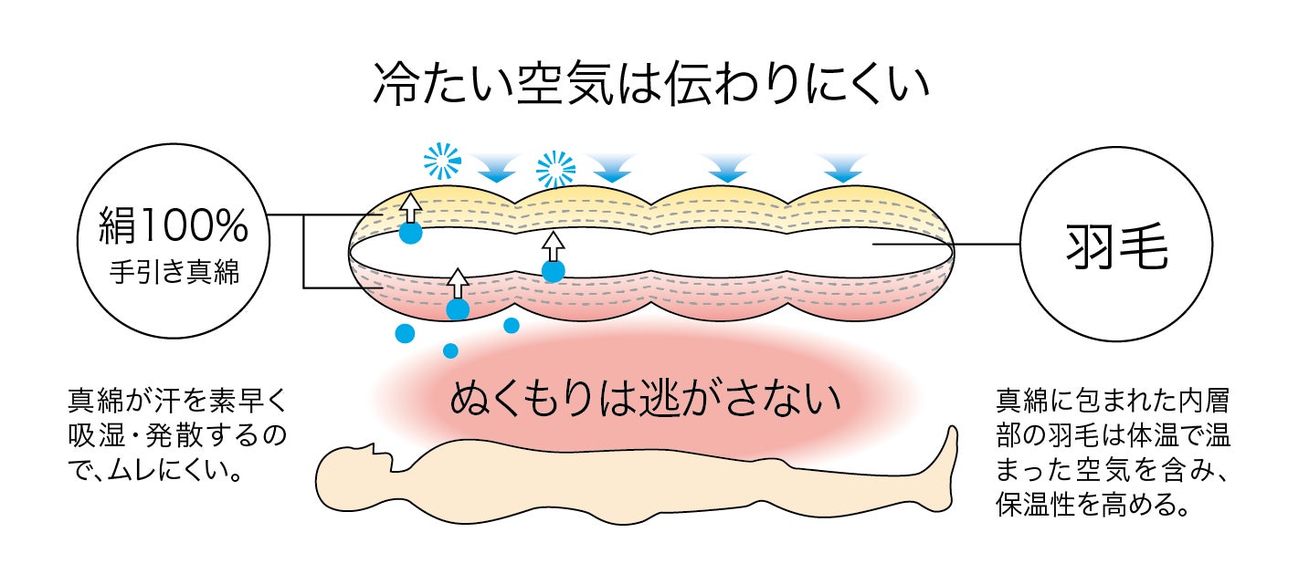 独自の構造及びシルクの特性により寝床内の湿度が羽毛ふとんに比べて抑制されるので、ムレを感じることが少なく快適に感じます。