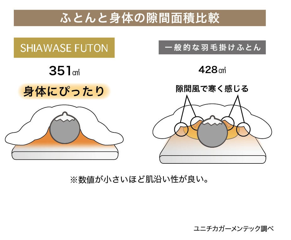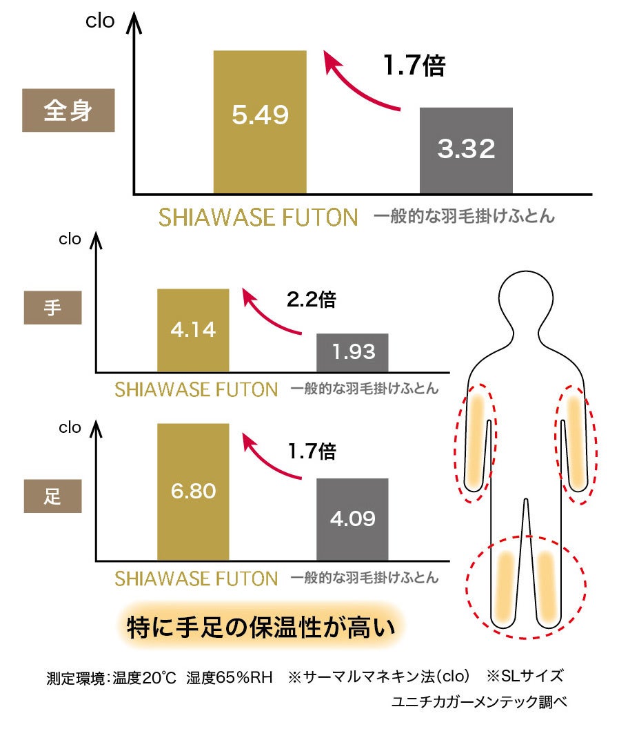 SHIAWASE FUTONは一般的な羽毛ふとんと比較すると、1.7倍も熱抵抗値が高く、特に上腕部から手、太腿から足にかけて明らかに保温性が高いことがわかりました。特に女性に多いと言われる、冬場は手足が冷えてなかなか眠れないという悩みの改善が期待できます。※clo値(クロー値)とは熱抵抗値の単位で、保温力を数値化したものです。