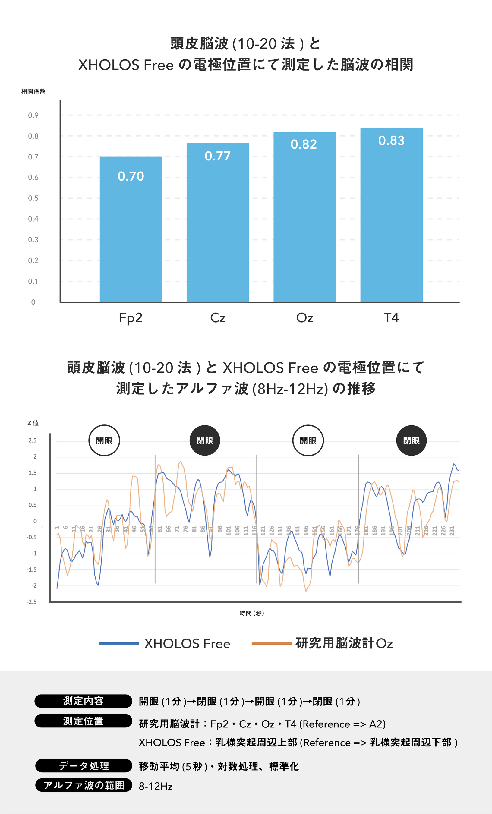 研究用脳波計との同時装着実験で相関0.82(Oz)の電位取得性能を確認しました。