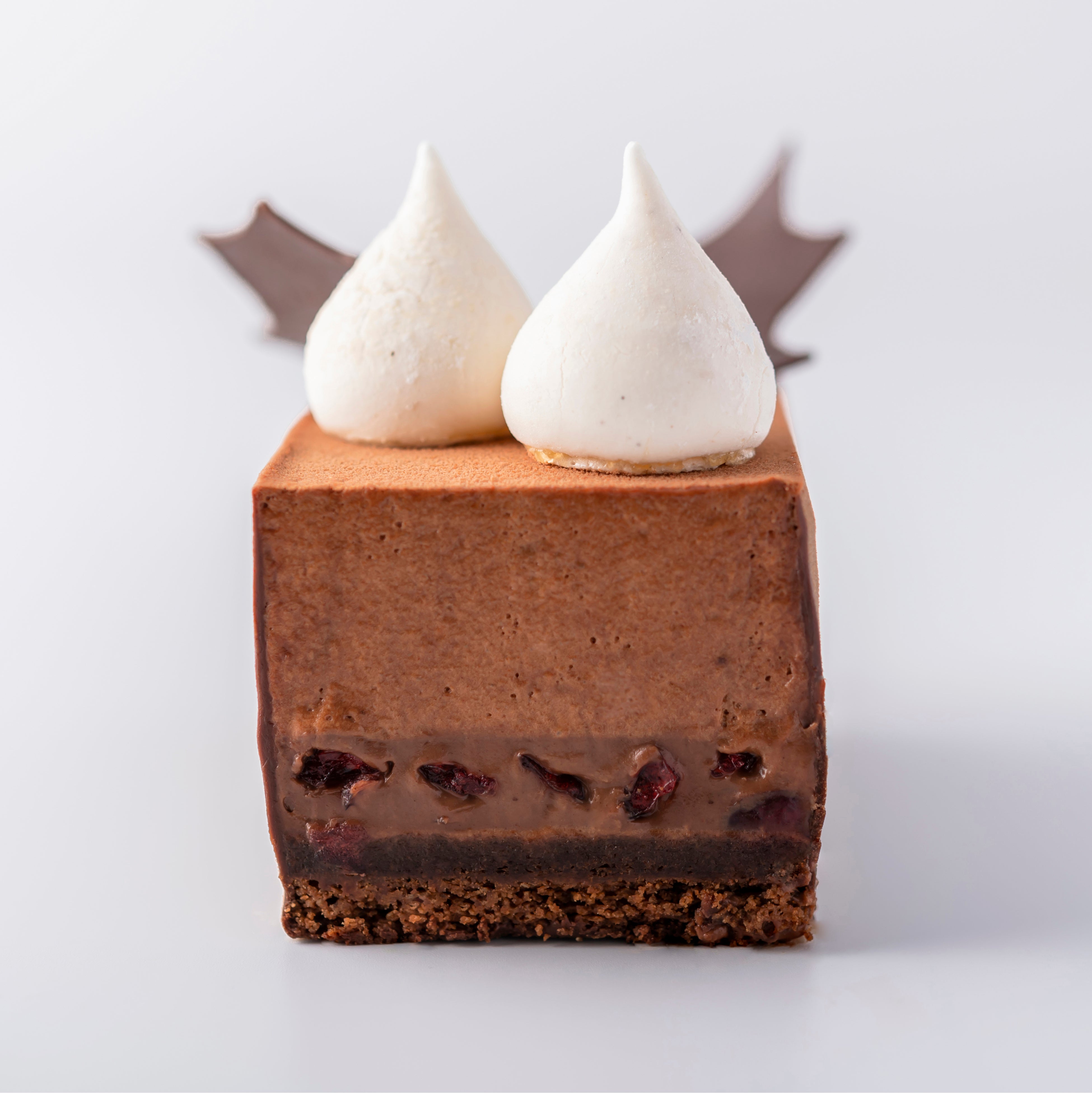 豊かなカカオのアロマと甘酸っぱいクランベリーの味わいが見事に調和した、大人のクリスマスケーキです。ふんわり滑らかな食感の「ムース ショコラ」、甘酸っぱいクランベリーが入った濃厚な「クレムー ショコラ」、さくさくとしたビスキュイとサブレが織りなす風味と食感のハーモニーをお楽しみください。