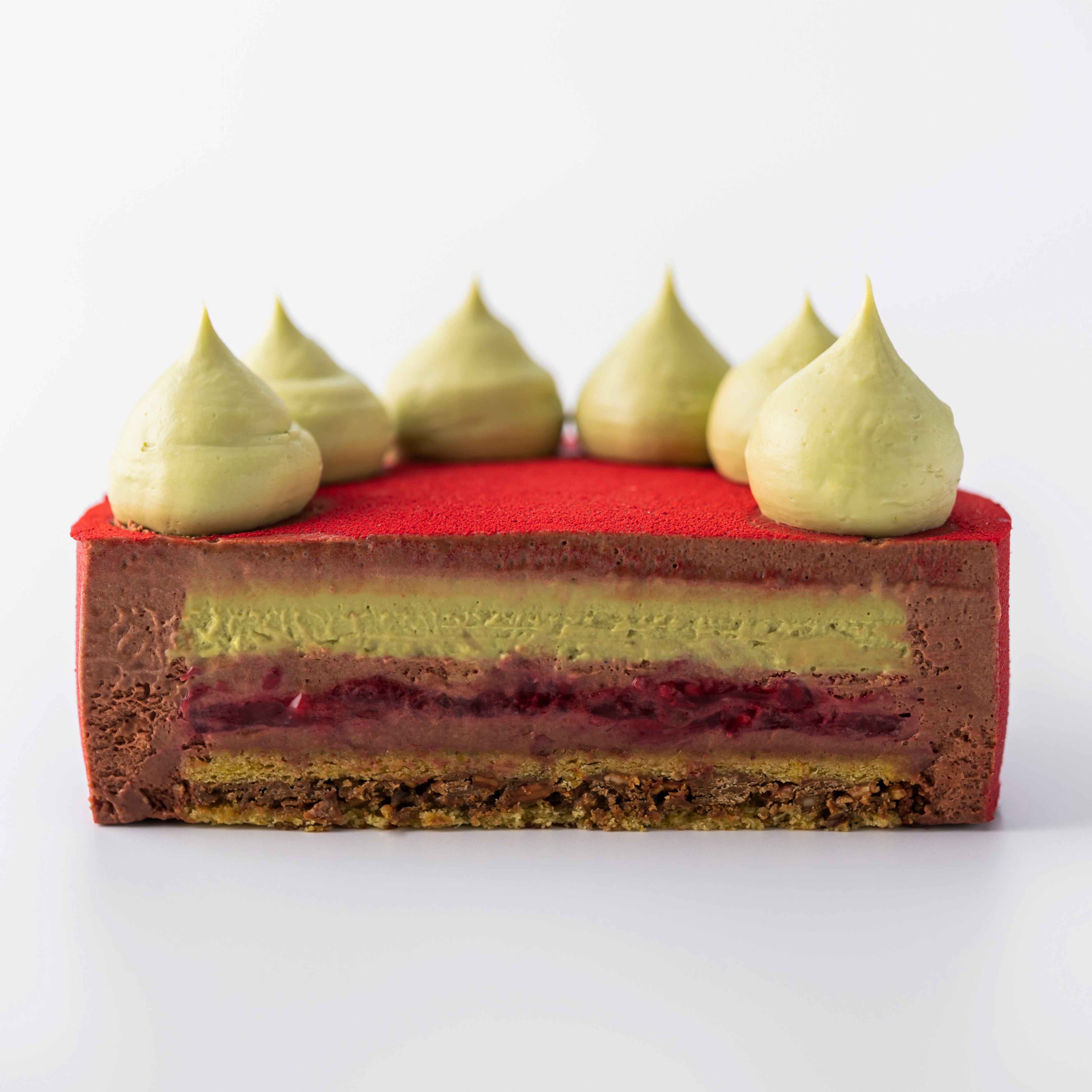 ピエール マルコリーニのオリジナルクーベルチュールを使った濃厚なチョコレートムースの中にピスタチオのババロアとビスキュイ、フランボワーズのジュレを閉じ込めました。