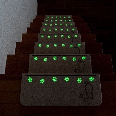 サンコーの蓄光階段マットは、光を蓄えて暗闇で光る蓄光プリント付きのマットです。ネコ柄は肉球型に、アイビー柄は葉っぱ型に光って段差が分かりやすい!夜間は段差の目印に、昼間はわんちゃん、ねこちゃんの滑りを防いで足元をサポートします。