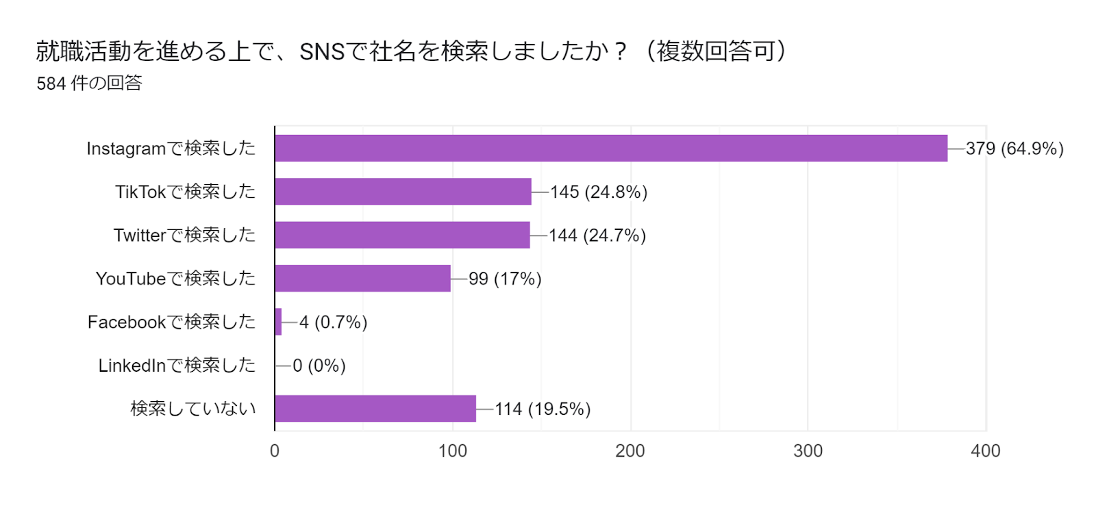 「SNSで社名を検索しましたか?」という質問に対し、80.5%が検索したと回答。内訳はInstagramが64.9%、TikTokが24.8%、Twitterが24.7%となりました。就職活動をする際に、情報収集の一貫として、SNSを活用する学生が多数派だということが分かります。