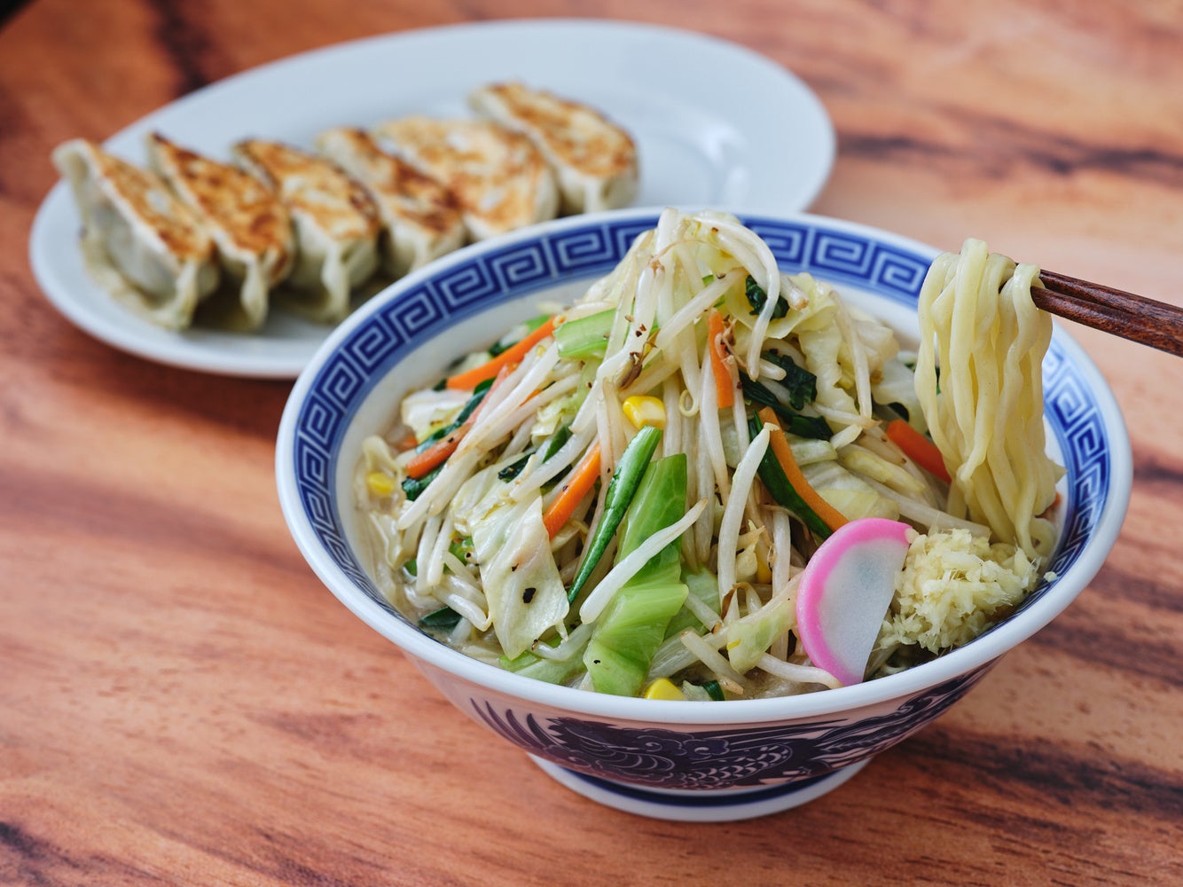 厚生労働省が推奨する成人一日あたりの野菜摂取量は350gと言われている。トナリのタンメンは一杯で360gの野菜が食べられるボリューム感のある商品。8種類の野菜は強力な火力で短時間で炒め、芳ばしく味わいもしっかり。塩豚骨のスープに極太平打ち麺がよく絡み、濃厚で旨味しっかりのタンメン。タンギョウ(タンメンとギョウザセット)とタンカラ(タンメンとカラアゲセット)のセットメニューも人気。