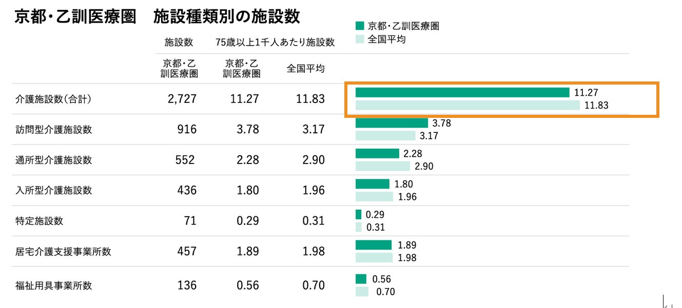 しかし、現状では京都市を含む京都・乙訓医療圏において、長期に療養を必要とする方のための療養病床数は全国平均の6割程度にとどまる(※3)ほか、介護施設数も全国平均を下回っています(※4)。