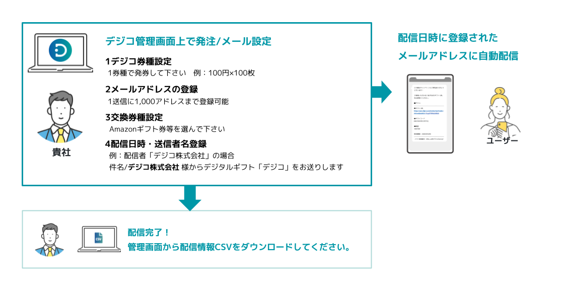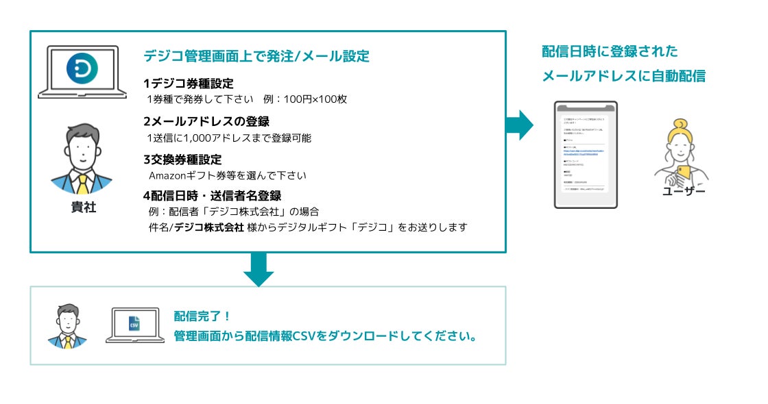 これにより、企業は管理画面からデジコの発注・配信先メールアドレス登録・メール配信設定まで行うことができ、より簡単にユーザーにデジコを送ることが可能になりました。