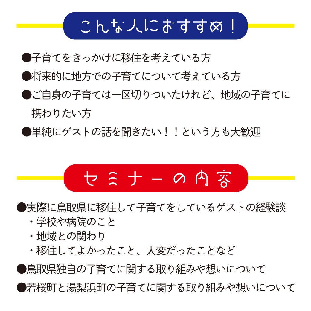 子育てを理由に移住を検討する方が多いことから、実際に鳥取県で子育てをしているゲストの方たちを招いて、移住までのスケジュールや利用した支援制度をはじめ、鳥取で子育てしてよかったことや大変だったことなどをお伺いすることで、今移住を考えている方や将来的に移住を考えている方の疑問や不安を少しでも取り除き、移住の一歩を踏み出していただければと考えています。