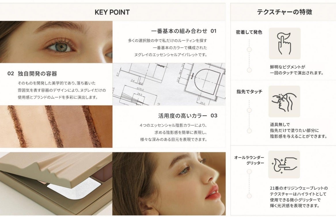 ヌグレイは人それぞれが持っている固有の美しさと、多彩だけど節制されている色彩のバランスで、手軽く自分らしい雰囲気を発現させるエッセンシャルビューティーブランドとして一躍韓国に広がりました。その人気はネット上で世界的に広がり、これから日本でも新商品リリースが次々と展開していく予定です。