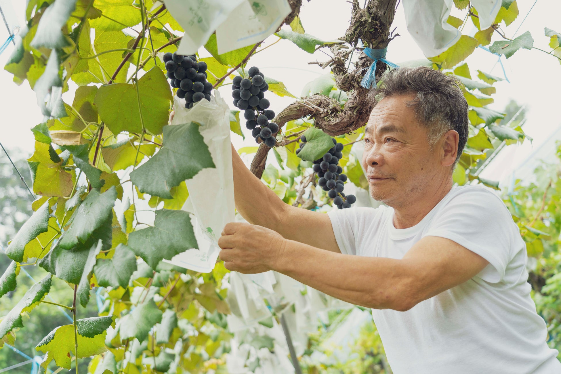 『安心院ワイン キャンベル・アーリー』用のぶどうを栽培していただいている山口稔さん・山口政夫さん。お二人は安心院葡萄酒工房設立時から、ずっと三和酒類のワインづくりにご協力いただいている大切なパートナーです。良いワインづくりには、ぶどう生産者の方の想いと努力が欠かせません。私たちは今後も、ぶどう生産者の方々と想いを共有して、ワインづくりに励んでまいります。