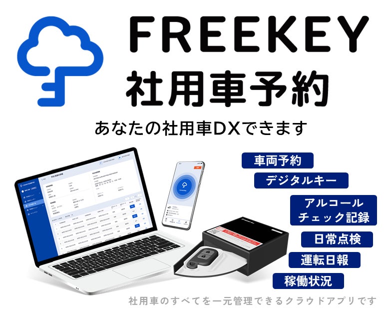 「FREEKEY社用車予約」は、アルコールチェック記録をはじめ、運転日報の記入や日常点検記録、車両の予約や車の施解錠までがスマートフォン1台で完結し、クラウド上でデータを一元管理できることから、ドライバーと車両管理者の双方の業務効率化につながります。また、スマートフォンで車の施解錠ができるデジタルキーを使用することで、非対面での鍵の受渡しが可能となります。