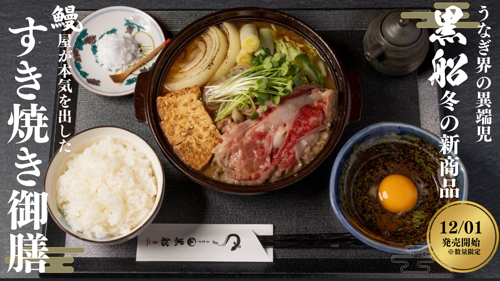 このすき焼き御膳は、12月01日より東大阪の布施名代 鰻屋 黒船にて限定数で提供される予定です。