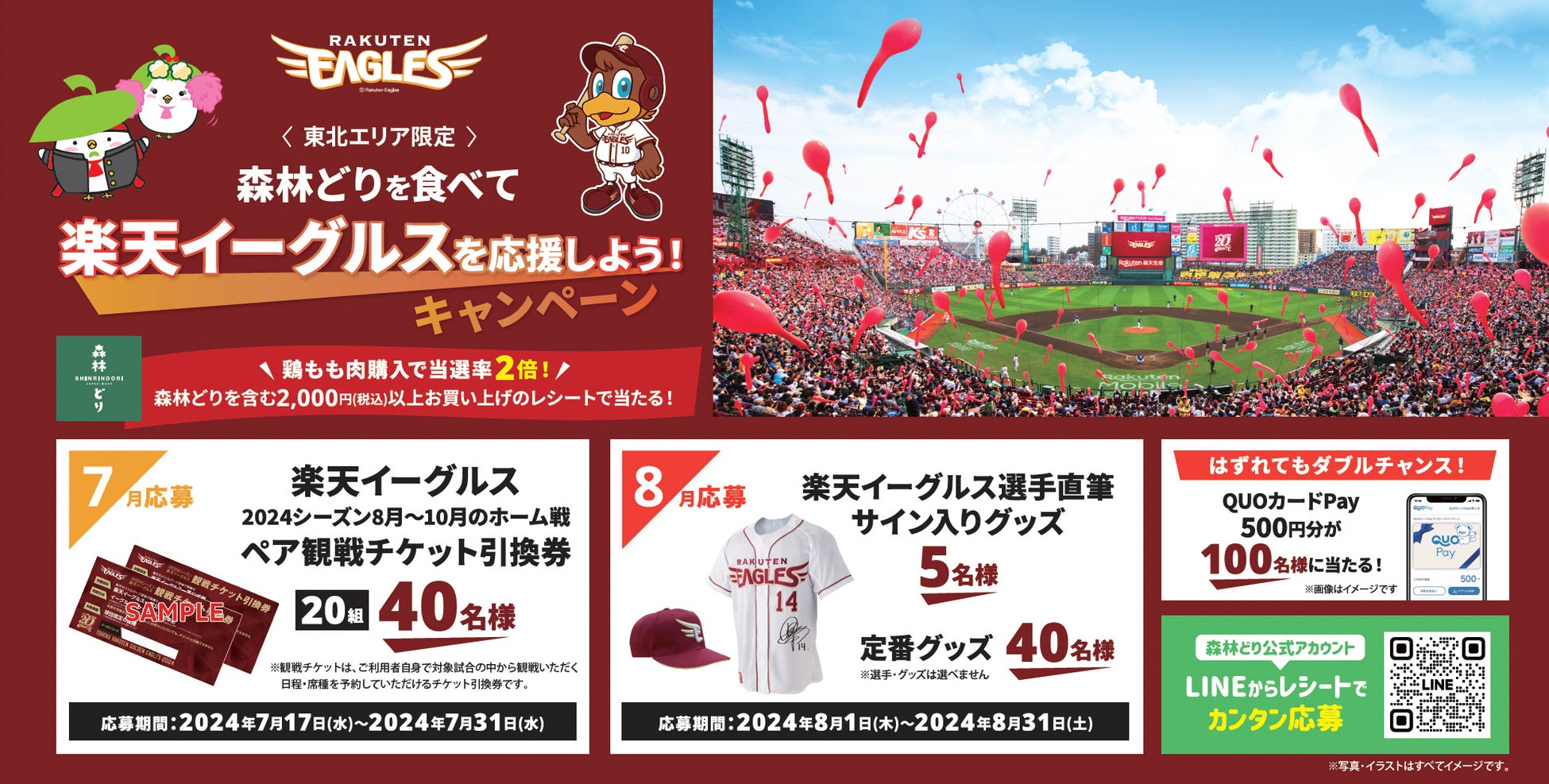 ウェルファムフーズが7月17日~8月31日期間で東北エリアの飲食店やスーパーマーケット等を対象に実施する、楽天イーグルスを応援するキャンペーンにベイクルーズストア 仙台 BOUL’ANGEが参加します。期間中に同店舗で森林どり商品1点以上を含む2000円(税込) 以上お買い上げの方が応募することが可能なキャンペーンで、抽選で楽天イーグルスの観戦チケット引換券等が当たります。