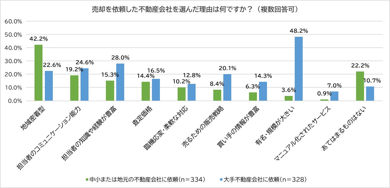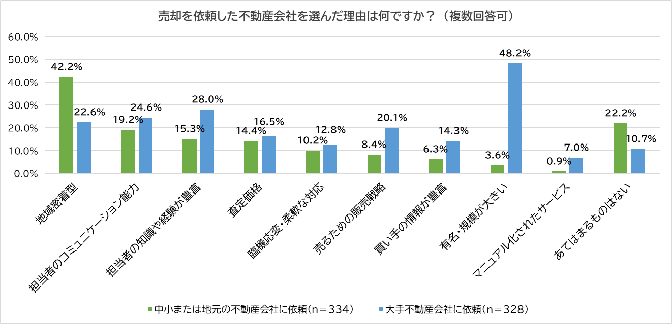 中小または地元の不動産会社に依頼した人(以下、「地元」)、大手不動産会社に依頼した人(以下、「大手」)それぞれに「その不動産会社を選んだ理由」を尋ねたところ、地元は42.2%が「地域密着型」(大手:22.6%)と回答したのに対し、大手は48.2%が「有名・規模が大きい」(地元:3.6%)と回答し最多となりました。