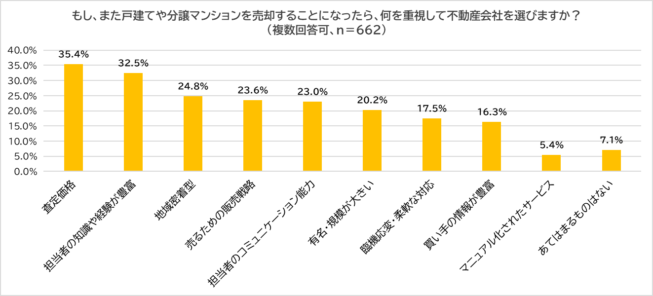 次に、「もし、また戸建てや分譲マンションを売却することになったら、何を重視して不動産会社を選ぶか?」尋ねたところ、「査定価格」(35.4%)が最多で、「担当者の知識や経験が豊富」(32.5%)、「地域密着型」(24.8%)、「売るための販売戦略」(23.6%)、「担当者のコミュニケーション能力」(23.0%)と続きました。