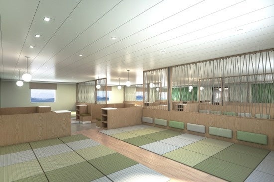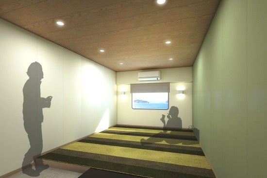 ・室内に上下2層のロフト式のびのび席を配置。上段は性能繊維構造体「ブレスエアー®」のマットレス、下段は遠赤外線床暖房「ヒートプラス」付きの畳敷きで、2名までなら夜行便でも快適