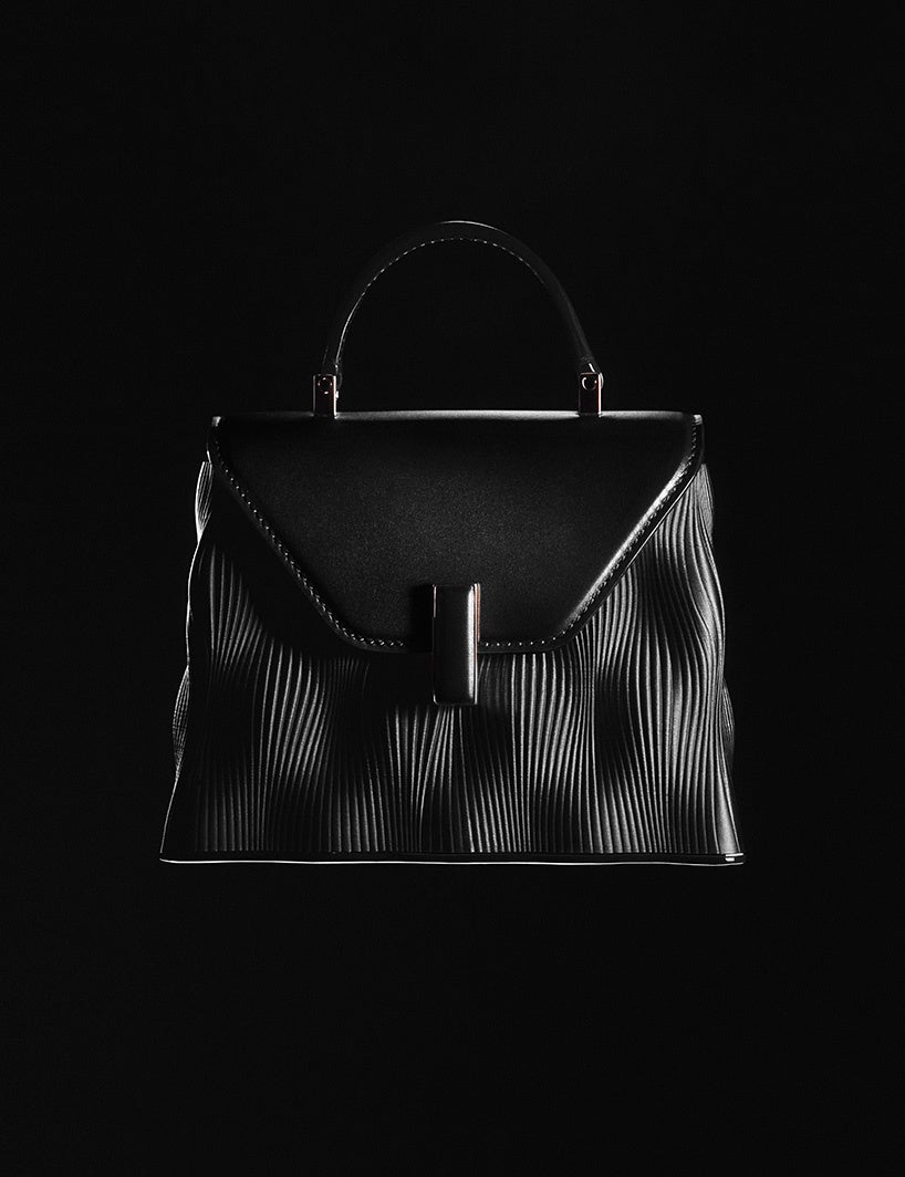 ヴァレクストラは、このプロジェクトの目玉であり最高傑作でもある、3D プリントのハンドバッグ「Iside Onda」を発表しました。Ondaはイタリア語で「波」の意味であり、ソフトなフォルムは、上質なレザーと洗練された金具のグラフィックな組み合わせの理想的なキャンバスです。3Dプリント技術と新素材の研究、そして伝統的なレザー技術を組み合わせたこのマシンメイドの不思議な表面は、コーンスターチ フィラメントをはじめとする再生可能なオーガニック素材が持つ延性によって、波打つような縞模様が実現しました。