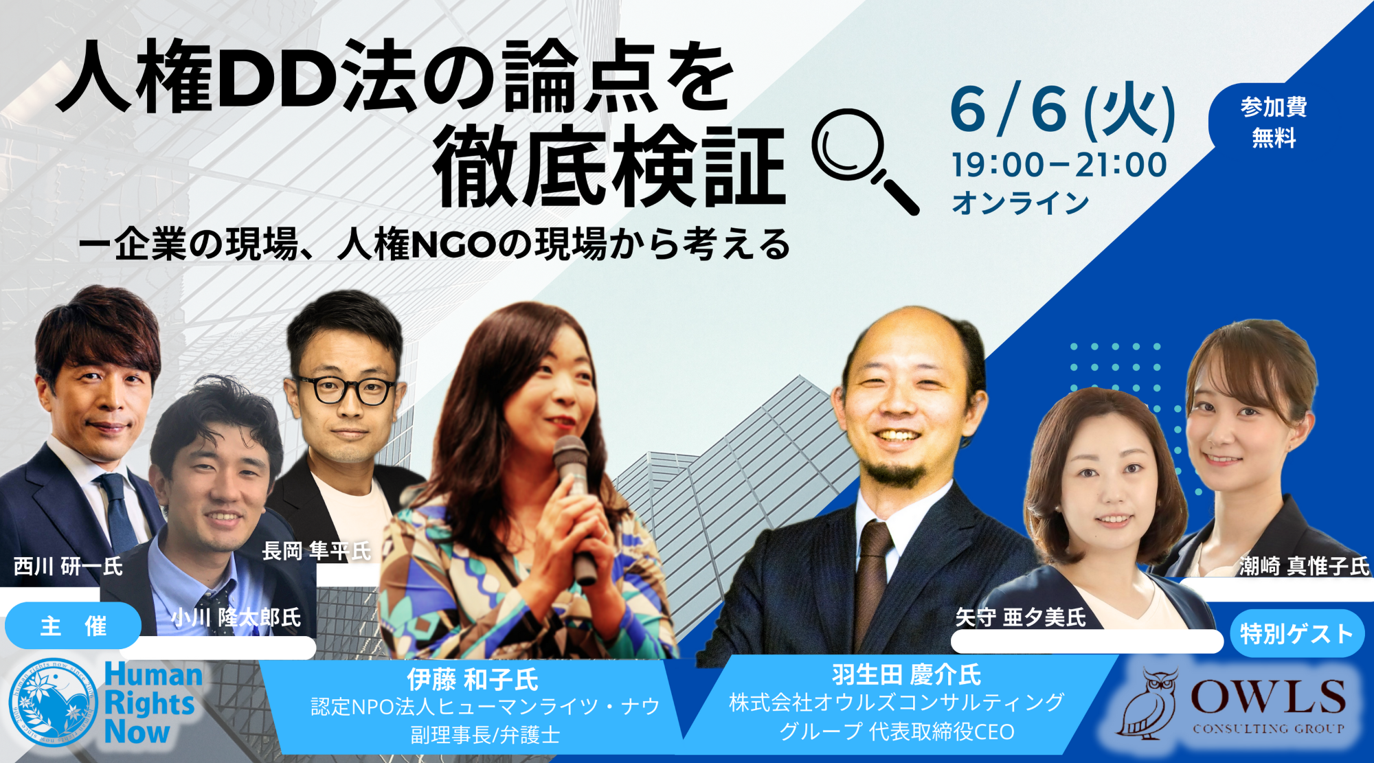 「昨年9月にガイドラインが出たばかりであり、人権DDを義務化するのは、日本ではまだ早いのではないか。」、「バリューチェーン『下流』は企業にとっては『お客様』であって、人権DDを実施するのは難しいのではないか。」など、多くの方が疑問に思われることが多い具体的論点について、(株)オウルズコンサルティンググループと国際人権NGOヒューマンライツ・ナウ、それぞれの立場から議論を交わし、深堀りしていきますので、この機会にぜひご参加ください。