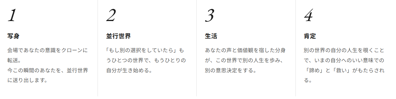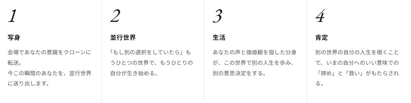 別の世界で分身が生きる様子を観測することにより、来場者は自身の人生や選択に対して、新たな視点や、いい意味での諦め・肯定といった感覚を得ることが期待されます。