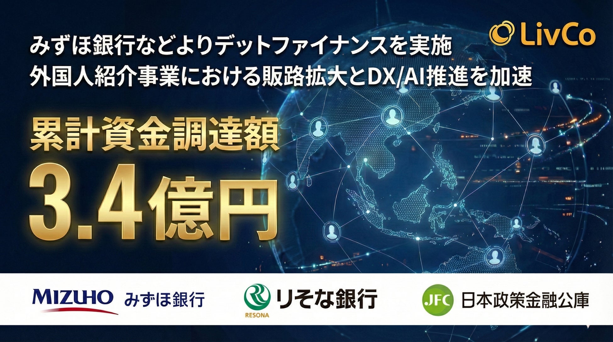 外国人特化型HRプラットフォーム事業(特定技能外国人紹介事業)を展開する株式会社LivCo(本社:東京都新宿区、代表取締役CEO:佐々翔太郎、以下LivCo)は、みずほ銀行・りそな銀行・日本政策金融公庫からデットファイナンスによる1.8億円の資金調達を実施しました。今回の資金調達により累計調達額は3.4億円に達しました。調達した資金を元に外国人紹介事業における事業拡大を加速してまいります。