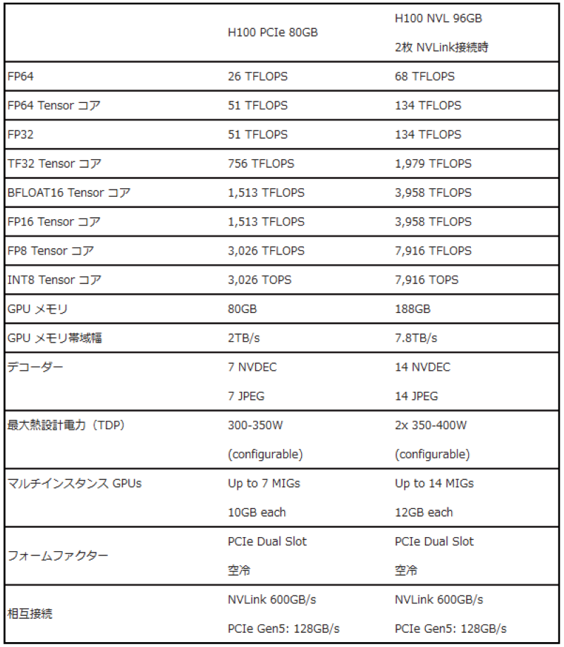 NVIDIA H100 NVL 94GB 仕様