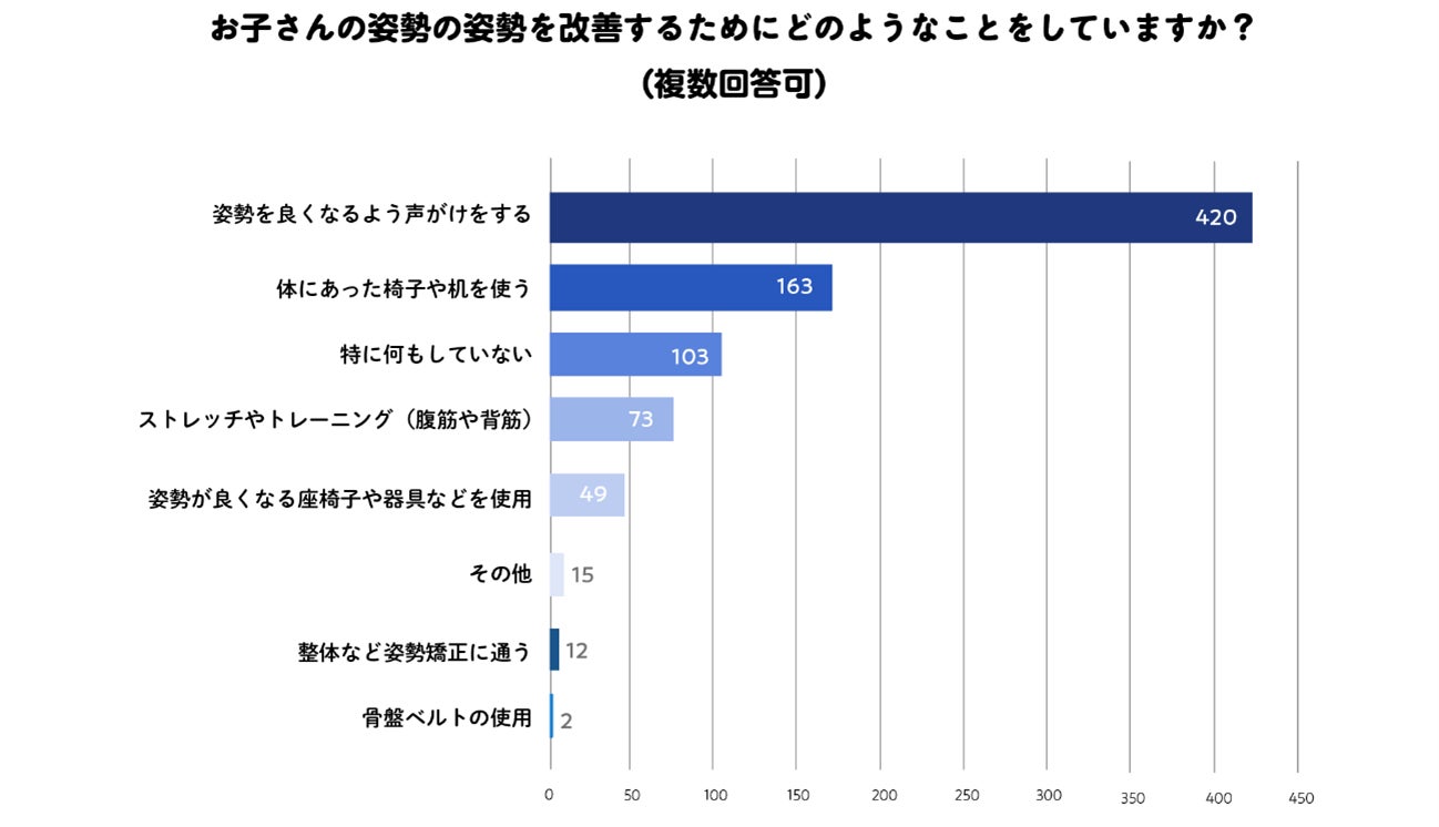 姿勢改善に向けて実際にやっていることで最も多かったのが「声かけ・注意」(69.7%)、「体にあった椅子や机を使う」(27%)でした。それ以外はどれも少数回答が目立ち、姿勢を改善したいと思ってはいるけれど、具体的な改善策を実行できていないことがわかりました。