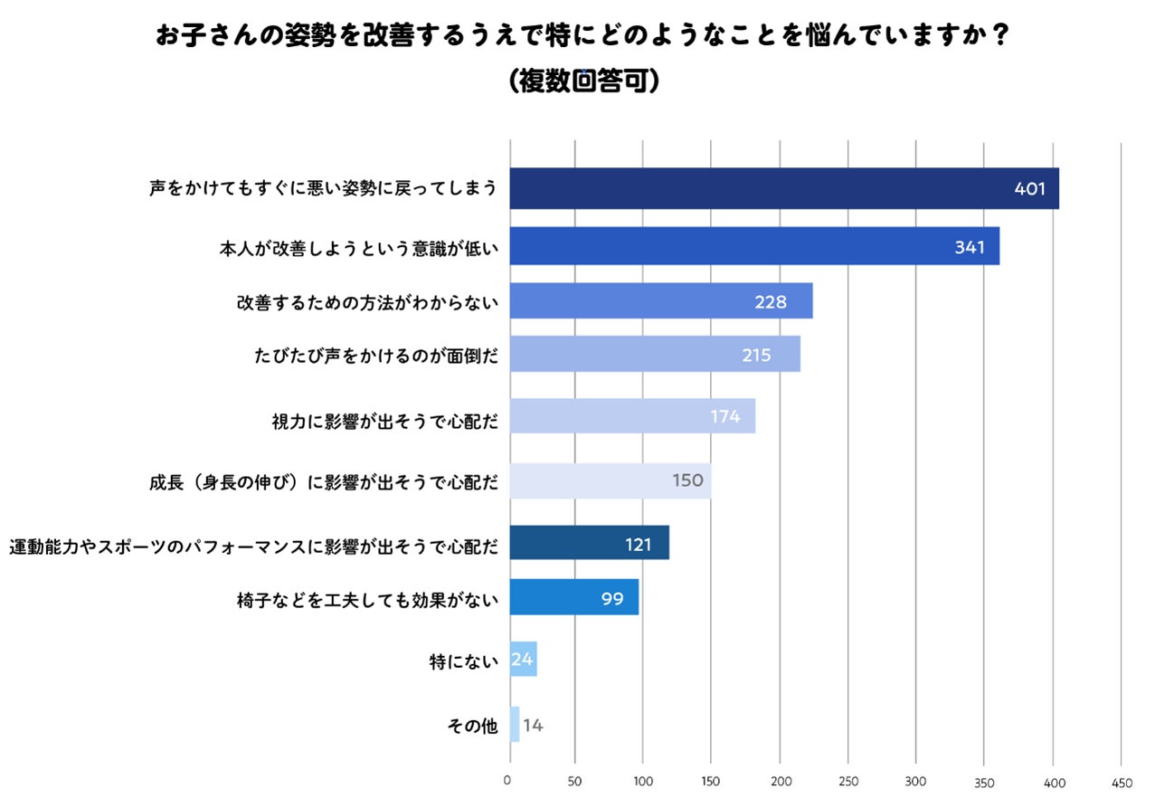 注意をしても「すぐに悪い姿勢にもどる」(66.5%)、「本人の改善しようという意識が低い」(56.6%)など、子ども側の意識の低さに課題を感じている人が多い結果に。一方で保護者自身が課題に感じている悩みとして、「注意するのが面倒」(35.7%)、「改善の仕方がわからない」(37.8%)という声も多く聞かれました。姿勢を改善してほしいと思いながらも、良い方法が見つかっていないことがわかります。