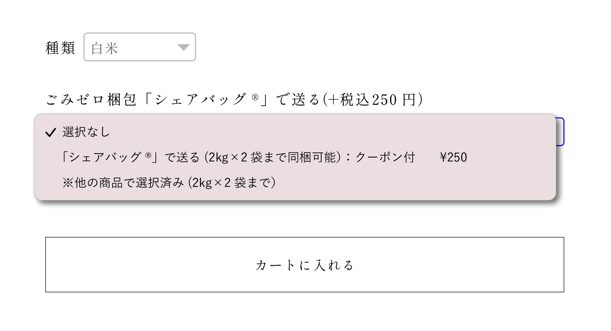 通常商品では、Natural Farming の商品ページから「ごみゼロ梱包シェアバッグで送る」を選択し、商品をカートに追加すると、その商品がシェアバッグで届きます。シェアバッグをご利用の場合、お米2kg×2袋まで一度に配送できます。