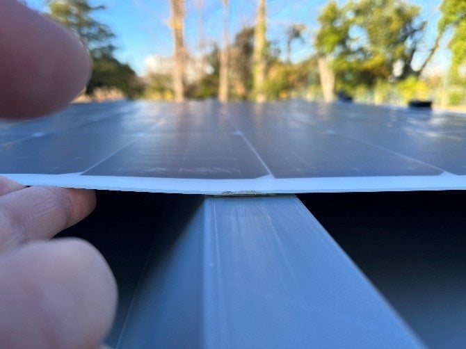 前述の通り、試験体は接着剤で貼りつけたものと両面テープで貼り付けたものの2種類いずれの試験体も予定していた通り、一切剝がれることなく、十分な強度があることが判明しました。試験後のモジュールの接着状況にも変化は見られませんでした。陸屋根はもちろんのこと耐荷重の問題で通常のガラスのモジュールを載せることができなかった折版屋根に太陽光発電所を建設することが可能となります。