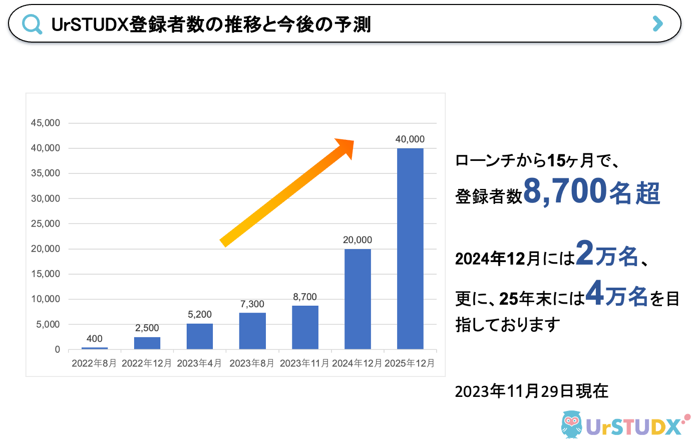 2022年からサービスを開始した『UrSTUDX(ユアスタディクス)』は、登録者が8,700名を超え、多くの方にご利用いただいております。