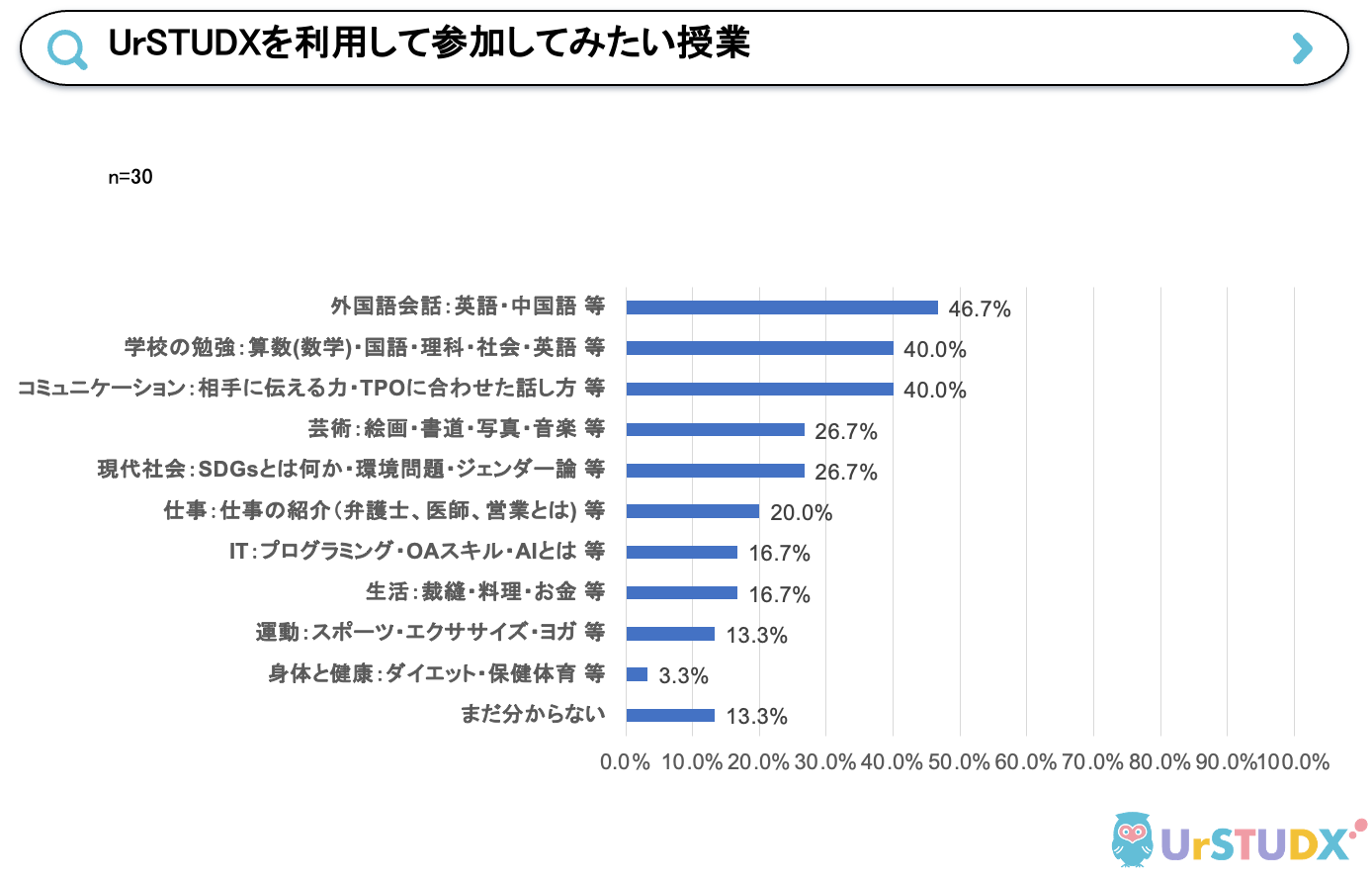 ”UrSTUDX(ユアスタディクス)を利用して参加してみたい授業”について46.7%のユーザーが「外国語会話」と回答しました。