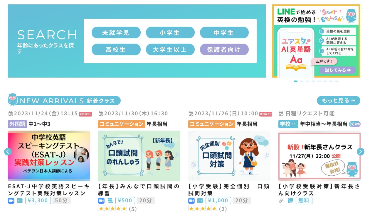 UrSTUDX(ユアスタディクス)には、未就学児に英語を親しんでもらうためにお父さん・お母さんがお家で実践できる保護者向けのクラスや、学生向けの英検対策、ESAT-J対策のクラスもあり、幅広い年代の方にご活用いただいています。