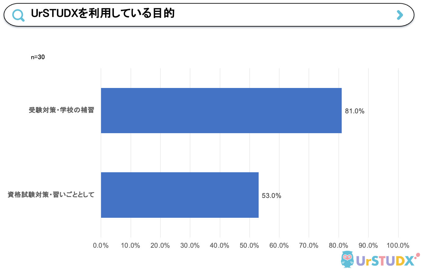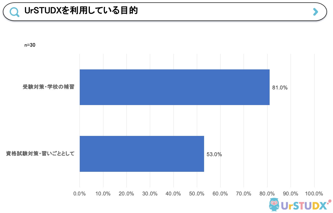 "UrSTUDX(ユアスタディクス)を利用している目的”については81%のユーザーが「受験対策・学校の補習」と回答しました。