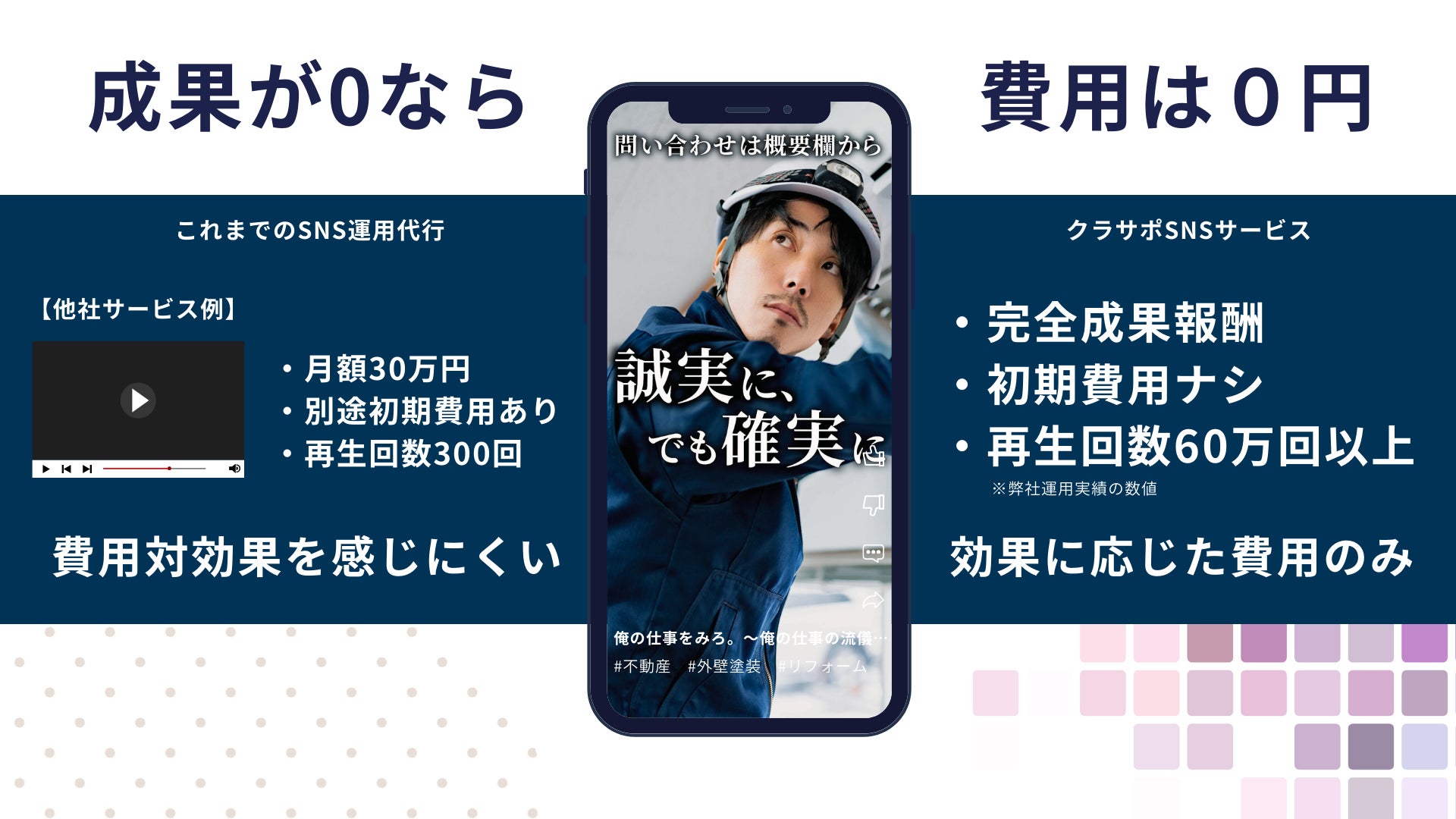 しかし、その高額な費用に見合った効果を得られる保証はなく、SNS運用をあきらめる業者様も多数いらっしゃいます。クラサポSNSサービスではそのような業者様にもスタートしてもらいやすいサービスとして、完全成果報酬というこれまでにないサービスを提供いたします。