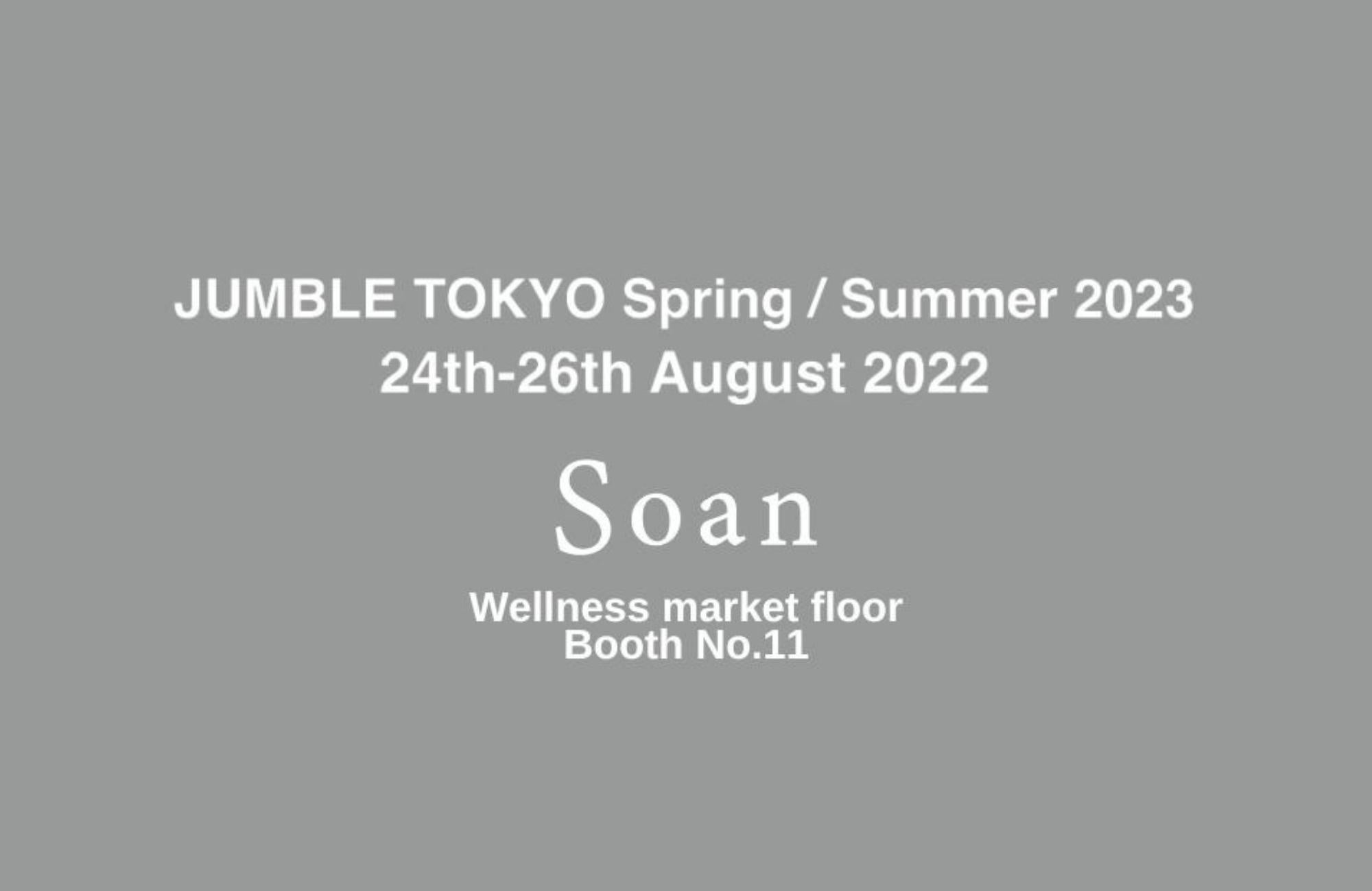 株式会社Soan(本社:東京都世田谷区玉川3-20-2 代表取締役:高橋政樹)は、2022年 8月24日(水)~26日(金)に 開催される【JUMBLE TOKYO Spring / Summer 2023 & wellness market vol.8 】への出展が決定いたしました。