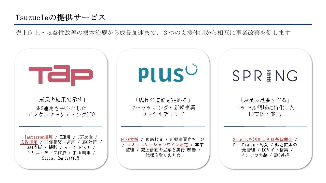株式会社Tsuzucleは、「価値あるものを、真の価値で世界に届ける」をビジョンに、デジタルマーケティングBPO、グロース支援、EC構築およびDX支援を行っています。