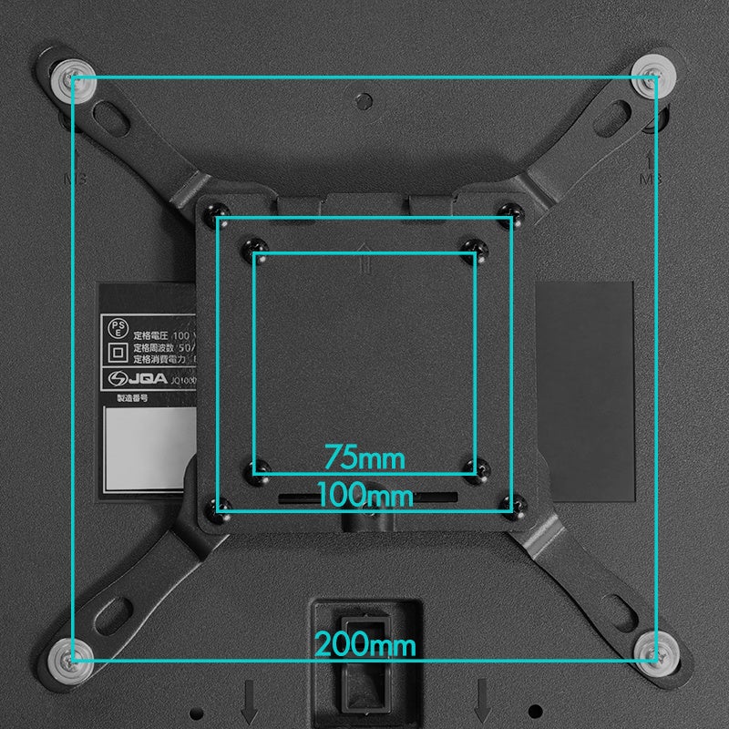 一般的なVESA規格(75×75mm、100×100mm)のディスプレイはもちろん、付属の延長マウントを付ければ、200×100mm、200×200mmの大型VESA規格にも対応可能です。