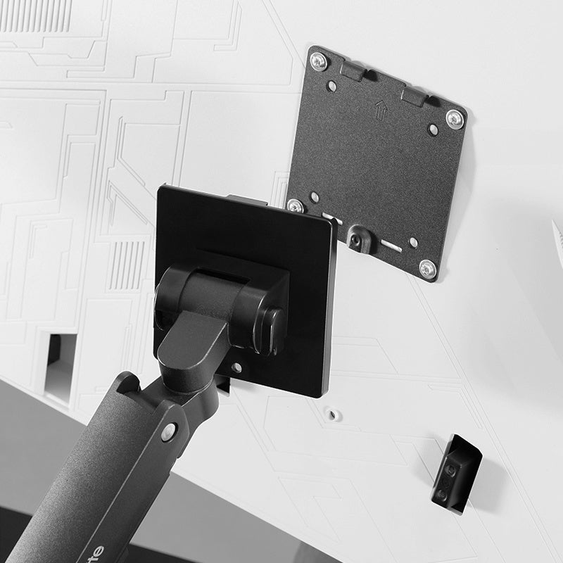 VESAプレートをモニター背面に固定し、アーム側のフックにはめ込むだけ。重量のあるモニターも簡単&安全に取り付け可能。