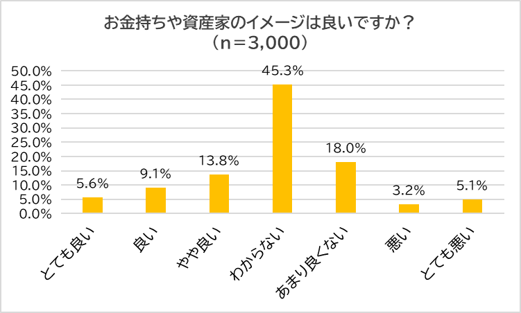 最初の洞察は、お金持ちに対するイメージが一部の人々にとってネガティブであることです。アンケート結果によると、回答者の26.3%がお金持ちに対して悪いイメージを持っていました。実際、この設問で最も多かった回答は「わからない」(45.3%)、つまり、お金持ちや資産家を得体の知れない存在として認識していることが示唆されます。