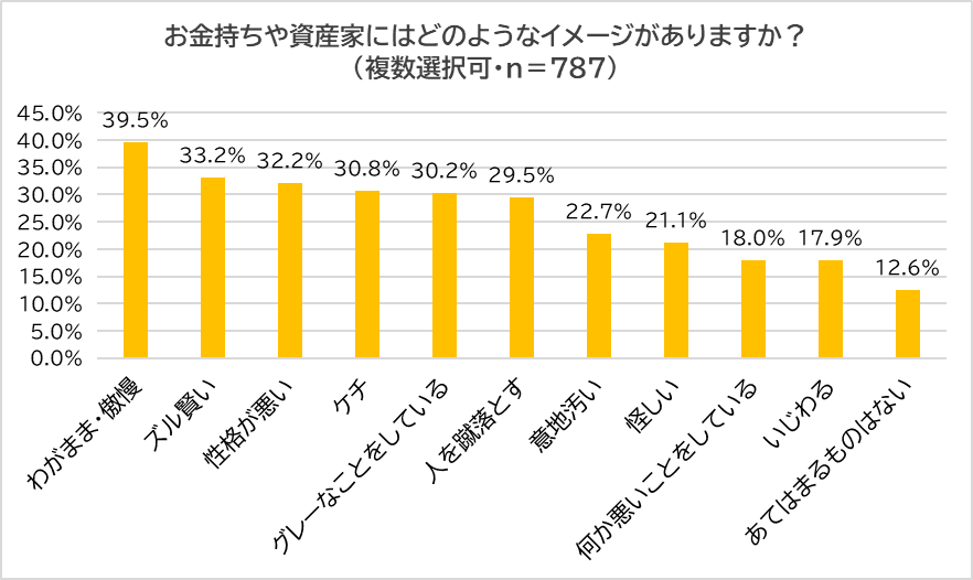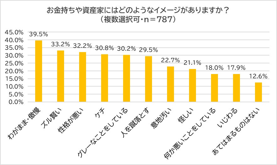 お金持ちや資産家に対して悪いイメージを持っている787人に「どのようなイメージがあるか?」尋ねました。最多は「わがまま・放漫」(39.5%)で、以下「ズル賢い」(33.2%)、「性格が悪い」(32.2%)と続きました。また、「グレーなことをしている」(30.2%)、「人を蹴落とす」(29.5%)、「怪しい」(21.1%)、「何か悪いことをしている」(18.0%)など「お金持ち=悪人」であるかのようなイメージを持っている人も一定数いました。